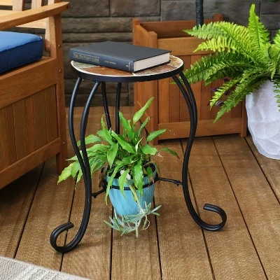 This is the perfect size plant stand for favorite potted flowers or greens. The charming design combined with the durable powder-coated steel frame and slate mosaic tiled top is sure to add an eye-catching accent to any indoor or outdoor living space. Use the top for a table space or for a larger plant. The lower planter opening is great for smaller planters so it can accommodate up to 2 plants at a time! It is also perfect for use as a side table for placing beverages, reading material and more!