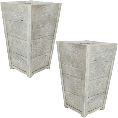 This faux wood design planter will add instant charm to any outdoor space while providing a place to display favorite plants, flowers, herbs, or vegetables. The planters feature a drainage hole on the bottom to ensure plants remain healthy and soil has proper drainage. The light gray wood tone finish gives the planters a modern look while ensuring they will complement most decor schemes. The fiber clay construction is designed with style and function in mind. Fiber clay is made from fiberglass, clay and a composite to make the pots as durable as fiber stone pots but lighter in weight and easier to move.
