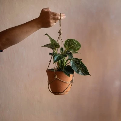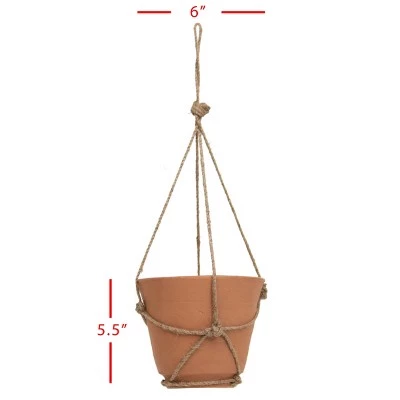 Exclusively from Foreside Home & Garden, a hanging terracotta pot that is a breeze to style with your favorite plants. Carefully crafted from natural terracotta clay, this tapered round planter is hand thrown by artisans in India. Detailed with a jute rope hanger that is tied around the pot to create a visually stunning design, giving off casual boho vibes. Accent plants in the home or garden or make a statement with sprawling plants.