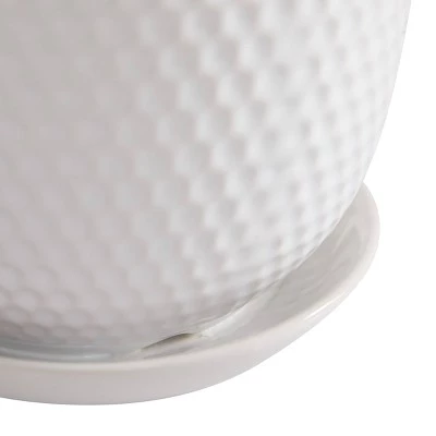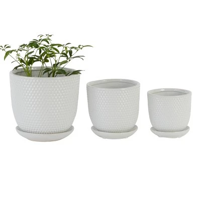 Whether you set them on a window ledge or a patio side table, this trio of planters will keep your favorite plants safe and secure. With their crisp, white design, the planters are a perfect match for contemporary, modern, or minimalistic spaces. A hammered design adds an appealing texture, while a saucer on the bottom collects excess water. The set features three different planter sizes so you can grow leafy friends of any size.
