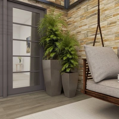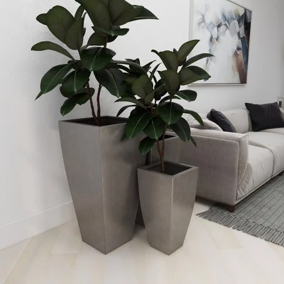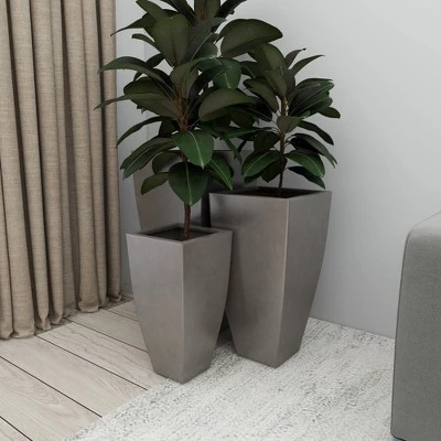 - A matte gray finish surrounds each tall trapezoid planter in this set