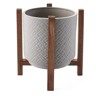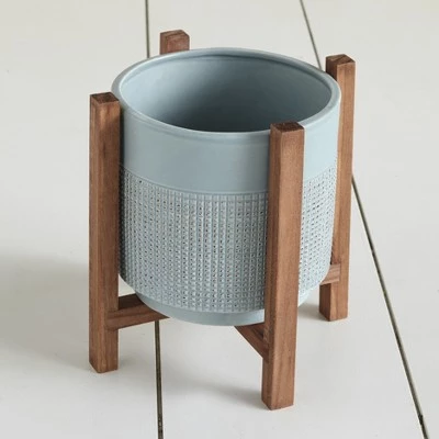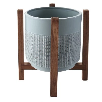 Grow your favorite plants in this attractive plant wooden stand with included, decorative ceramic planter that provides your plants with a look that’s both modern and classic. The ceramic plant pot sitting in a wooden stand makes lovely table dΓ©cor. The softly colored flower pot is textured for additional interest. Use it for outdoor or indoor plants including succulents, herbs or flowers. Ceramic and wood. Indoor/outdoor use. Assembly required; assembly hardware included. 8″ dia. x 8-1/4″H, overall – Pot, 6-1/2″ dia. x 6″H