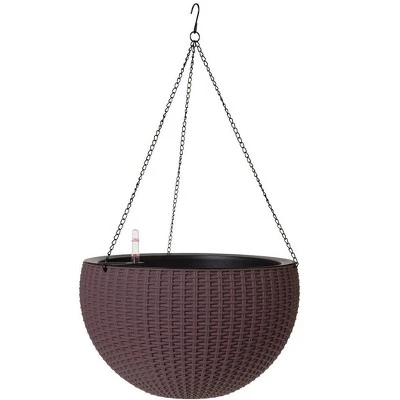 With a surface texture that resembles woven wicker, this hanging basket adds interest to flower and foliage displays without detracting from the plants. The built-in self-watering feature includes a reservoir with an easy-fill port that lets you monitor the water level. Water in the reservoir provides a constant supply of moisture to roots, helping eliminate cycles of over- and under-watering that can stress plants. A removable plug allows for drainage of any excess water.
