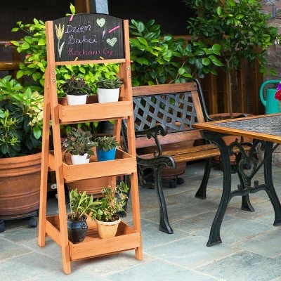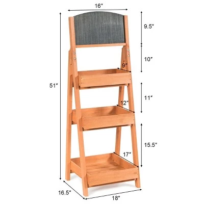 Don’t leave your plants alone on the floor, prepare a home for them! Our shelves is made of solid wood, it’s solid, durable and environment friendly. 3-tier structure gives you more spaces for more plants. At the same time, it not only lightweight but also just takes up a less ground space. It has a lot of safety designs, such as triangular structure which can increases stability, every slatted shelf has four borders which can prevent the plants fall from anywhere. The slat design not only can increases the circulation of air and ensures breathability of the plants, water comes out of the bottom of the pot to automatically water the plants below. By the way, our shelves don’t fear water because the surface of the flower rack is painted with waterproof water-based paint. Our flower pot shelf stands are for indoor and outdoor use, with this shelf, your home will become tidier.. A-Frame Sidewalk Menu Chalkboard Sign Wooden With 3 Plant Display Shelf Shelves. Specification: Color: Natural . Main material: Fir. Overall size: 18” x 16.5” x 51” (L x W x H). Net weight: 12 lbs. Maximum loads: 66lbs. Interval height: 10”, 11”, 15.5”. Load-bearing capacity of each layer:22lbs. . Package includes: . 1 x 3-Tier flower wood rack. 1 x Instructions.