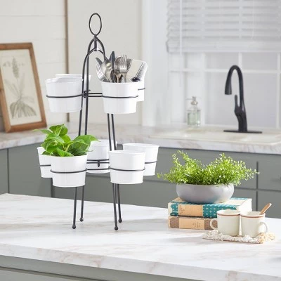 - Features nine equal-sized planters/utensil cups with ring handle for easy transport