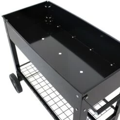 Cultivate a garden bed with this simple, multipurpose storage planter; one place for all your gardening tools, pots, and soil bags. With an ergonomic design that helps limit the excess of bending and kneeling, it allows you to grow any plants or flowers in this 8.75-inch deep garden bed and store all your gardening tools and soil bags on the bottom shelf, up to 15-inches in height. Your planter is built with lockable wheels for easy mobility towards the sun and out of the way when friends are over; easy movement with locks that ensure your planter stays in place. This planter also promotes healthy plant growth with liners included, which retains the soil and protects the garden bed from damage. Built-in drainage holes allow excess water to seep through, while sturdy crossbeams add extra support and stability to your garden. For placement purposes, the dimensions are as follows:Overall Dimensions: 48 in. x 23.25 in. x 32 in./121.9 cm x 59 cm x 81.3 cmPlanter Depth: 8.75 in./22.2 cmShelf Height: 15 in./38.1 cm