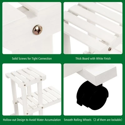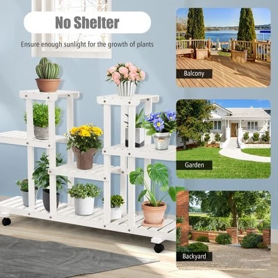 Our rolling flower stand can fully play its multi-functional role inside or outside your home. Equipped with solid and weather-resistant wood construction, the plant stand can be placed at your balcony, living room, garden or patio etc. not only to display beautiful flowers and vigorous potted plant but also to store or exhibit your photos, trophies, books and other beautiful artworks. 12 high and low pots racks makes full of space to highlight all plants and makes them not affect with each other. Each rack provides sufficient space to accommodate plants, and hollow-out design make it convenient for you to water plants without messy. White powder coat makes it anti-corrosive and weather-resistant. Flexible but lockable wheels make it easy to move and transport your plant. It will be an ideal choice for your home! . Specification: Material: Fir Wood. Color: White. Overall Dimension: 47.5″x10″x21.5″(L XW XH) . Net weight:12lbs. Weight Capacity of per Tier:11lbs. Package Include: . 1 X Rolling Wood Flower Rack.