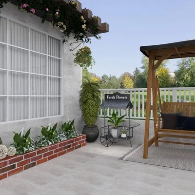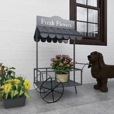 - This rectangle plantstand features a roofed trolley cart design with round decorative wheels and a long handle