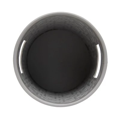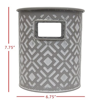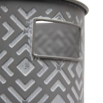 A modern flower tin from Foreside Home & Garden is characterized by a light gray metal with geometric patterning and finished with a distressed white washing. There are cutouts for two handles on the sides of the tin. The light and airy look of this planter is complemented by rich greens.