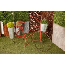 Verdant plants and flowering shrubs provide serene respite in these hectic times. And they need the proper holder to maintain a home’s theme. Crafted from metal and feature a bicycle frame with three galvanized planters, this plant holder elevates the look of farmhouse and rustic themed homes and gardens. The bicycle has a red frame and black wheels with gray metal pots, fully heightening its vintage look. A perfect holder for leafy shrubs and flowering plants to liven up any space in your home Wipe clean with a dry cloth. Suitable for indoor and outdoor use. Vintage inspired. This item comes shipped in one carton. Maximum weight limit is 5 lbs. per shelf.