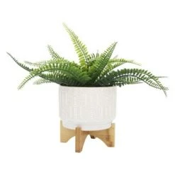 Ceramic planter with circles design on the exterior. It has a non-glossy finish and the wood stand is glued to the planter. This beautiful piece will be a great addition to your living room or entry way.Sagebrook Home has been formed from a love of design, a commitment to service and a dedication to quality. They create and import fashion forward items in the most popular design styles. Backed with years of experience in the textile field, They are now providing a complete Home decor story. the combination of wall decor, furniture, lighting and Home accessories are all coordinated with textiles to provide a complete Home look. Sagebrook Home is committed to providing the best Home dΓ©cor and accent pieces at value prices.