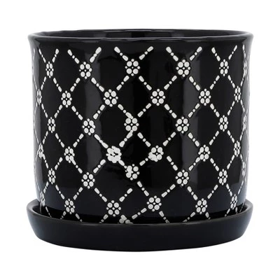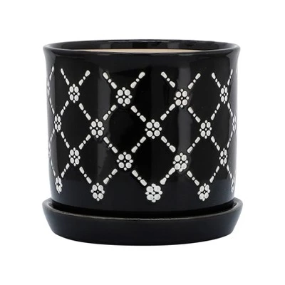 This ceramic planter displays a stunning white chained daisies pattern on a black background, creating an astonishing design that is enhanced by a saucer, to avoid any water spills on your carpet and or furniture!Sagebrook Home has been formed from a love of design, a commitment to service and a dedication to quality. They create and import fashion forward items in the most popular design styles. Backed with years of experience in the textile field, They are now providing a complete Home decor story. the combination of wall decor, furniture, lighting and Home accessories are all coordinated with textiles to provide a complete Home look. Sagebrook Home is committed to providing the best Home dΓ©cor and accent pieces at value prices.