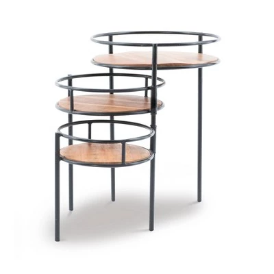 Multiple tiers of natural acacia wood make this plant stand side table the ideal way to showcase cascading greenery, unique succulents, or any other personal collection. A black metal iron frame adds durability without detracting from the display. This piece has the unique ability to pivot on its main leg giving you multiple configurations and making it easy to morph into the shape you need. Available in three different options, this piece utilizes clean, minimalist style to beautifully present your personal treasures.