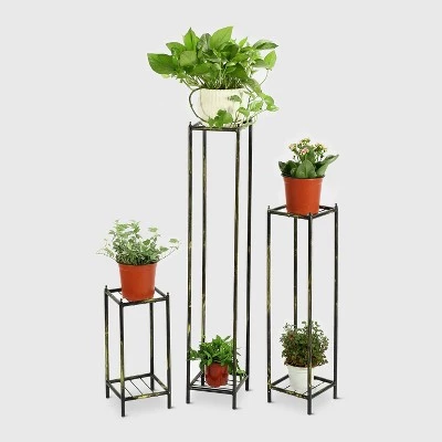 Provide your plants some stylish lattice design to set on with these set of 3 pcs square cast iron plant stands. Each of these stands are great together or spaced apart throughout your garden. Bring a touch of nature into your living space with this stunning plant stands. Durable lattice square top, beautiful side vine patterns, and a powder coated black and gold lacquered metal frames give this plant stand set both style and versatility to complete your decor in the foyer or out on the patio. Thanks to the different sizes, it’s easy to create a tiered look with this plant stand. Lighter weight than it looks, it is ideal for showcasing floral and greenery singly or as a grouping of varied heights. Set them in a close arrangement in the corner of your home office, and top them with fresh succulents, glowing candles, and floral vases to create a relaxed and uplifting display.