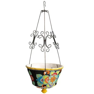 Our Talavera Hanging Planter adds color and style to a patio, porch, deck or indoors. The hanging planter is crafted in traditional style in Mexico using hand-thrown ceramic clay. The included hanging hardware is both decorative and functional. A finial at the bottom adds extra flair. The planter features raised designs and colorful tin glazes in a multicolor design with your choice of a red or white background. The bright colors complement greenery and floral plantings perfectly. Drainage hole at bottom. Each planter is shaped on a potter’s wheel, dried, then fired in a kiln. A multi-step process is used to apply the glaze, then it’s carefully hand painted in the colorful designs shown.