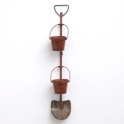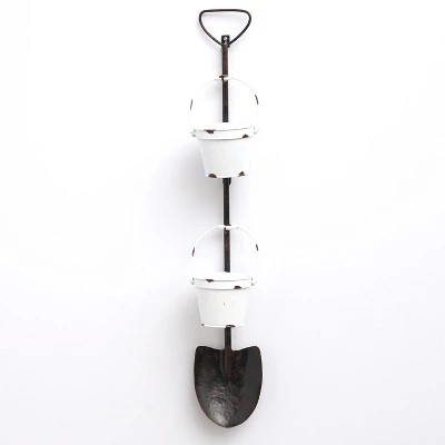 This rustic planter will add some farmhouse charm to your yard or porch. Hang or lean this distressed garden shovel against a fence or wall and fill its two pots with your favorite flowers. Great for plants that like to hang over the edge of their pots. There is a keyhole opening at the top of the tool to hang it. This is a great way to combine a cute decorative garden accent with a functional planter. Makes a great gift for a gardener. Overall: 32.5″H x 5.5″W x .5″D; Planter bucket: 3.75″H x 5″W x 4.75″D; Bucket handle: 5″L x 5.25″W. Metal.