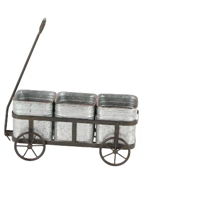 Full of Farmhouse charm, this large metal planter features three galvanized metal plant boxes nestled in a decoratively rusted dark brown metal wagon planter. Easily pull this outdoor planter to your desired spot by the long metal handle, which also adds a decorative authentic accent. A decorative garden piece that fits an Old English or traditional landscape design. Designed with black rubber stoppers at the base that prevent scratching furniture and table tops, as well as sliding around. Wipe clean with a dry cloth. Easy to place and decorate on patios and garden areas. Suitable for indoor and outdoor use. Made in China. No drainage holes. This set includes 3 pots in a wagon. Farmhouse-themed style. This item comes shipped in one carton.