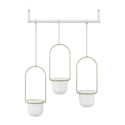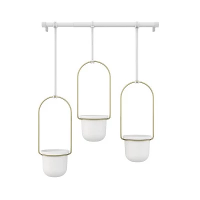 Do you love the look of hanging plants in your window, or the idea of growing an indoor herb garden in your kitchen, but no room to keep them? Then this clever hanging planter is perfect for youโฆ Introducing Triflora Hanging Planter from Umbra. Triflora is a hanging planter for indoor plants that combines the utility of a drapery rod with the beauty of potted plants.Great for herbs, succulents, vine plants and more, Triflora Hanging Planter mounts to your wall or ceiling and adds functionality to your window by turning it into a space for growing plants. You can adjust the length of Trifloraโs ropes and slide them anywhere along the metal rod to customize the position of each hanging pot. The durable melamine pots can hold standard 3-inch diameter pots (so thereโs no need for re-potting). This unique and innovative design was created by Dayna Mailach and Chris Snell for Umbra and is the winner of the 2019 IHA (International Housewares Show) โBest of Showโ award. Triflora Hanging Planter measures 24 x 5 inches (60.69 x 12.7 cm) and comes with 43 inches (109.22 cm) of rope; perfect for any standard-size 24-inch window. For an easy and elegant space-saving solution for growing plants, or a herb garden, in your window, order Triflora from Umbra today.