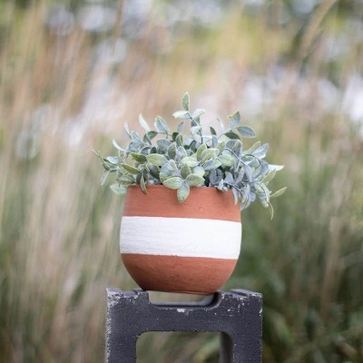 Using color blocking to enhance the texture of the rich terracotta clay, a bold white stripe wraps around the center of this terracotta pot. Hand thrown and hand painted by artisans in India, this terracotta planter combines simple design with intricate craftsmanship. Perfectly suited for accenting indoor and outdoor spaces with boho decor styles. Due to the handcrafted nature of this item, each piece is unique.