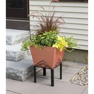 The geometric Marion Planters from Achla Designs have a simple architectural detail characteristic of the Prairie Style, equally at home on the porch of a Craftsman bungalow, desert patio or tropical lanai. These boxy faceted planters are ideal for showing off a sculptural container mix, cactus or prized bonsai. Stands are sturdy one-piece construction, in two sizes, 14 ยฝ -in with low planting container or 23-in with tall planter. Marion Planter pots are made from Copper plated galvanized steel, with wrought iron stands powder coated in Black. All of our Solaria Collection plant stands and hangers are designed for indoor and outdoor use, with materials and finishes for maximum weather resistance.