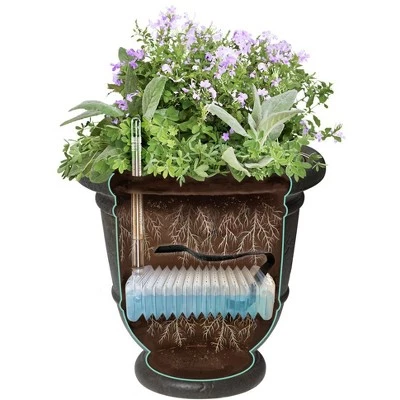 Shapely urns make an impressive statement lining a path or flanking an entryway. They’re made from lightweight resin with a hand-painted mineral finish that resembles authentic stoneware. Inside, our exclusive self-watering system reduces watering chores and provides plants with the consistent moisture they need to thrive. Simply fill the reservoir with water through the convenient fill tube. A pre-drilled overflow hole allows excess water to drain. This durable, lightweight planter will hold up in extreme weather, and is UV-protected to eliminate fading in the sun. Won’t crack or chip in temperatures to -20 degrees F.