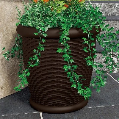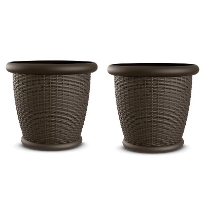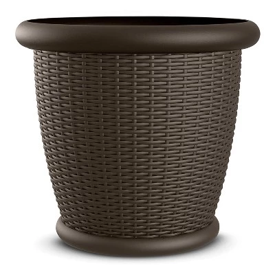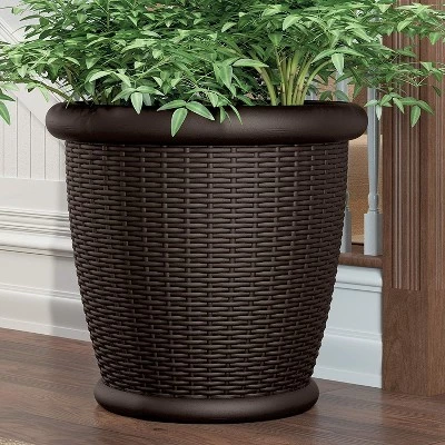 Give your plants a happy home in these 4 Suncast Willow 22-Inch Diameter Resin Decorative Wicker Patio Planter Pots.This decorative resin pot features a contemporary wicker finish and functions as both an indoor and outdoor planter. Designed to retain moisture longer than standard clay pots, this planter is ideal for growing healthy plants. Wherever you put it, this flower or plant pot adds to the ambiance of any indoor or outdoor space.The lightweight construction makes this pot easy to handle, especially when rotating plants. The UV-protected materials ensure that this planter will look nice for several seasons. The 22-inch diameter and 20.13-inch height makes this planter large enough to grow a variety of flowers and plants.The drillable drain-holes in the base let you customize this planter to your needs.Bring some beauty to your home or yard with these 4 Suncast Willow 22-Inch Diameter Resin Decorative Wicker Patio Planter Pots.