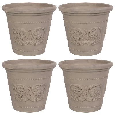 Pair a lush, blooming plant with this container for a refined accent to your outdoor living space. Featuring an elegant design of leafy vines, this planter has a hand-painted finish in a beautiful warm hue. Constructed of contemporary linear low density polyethylene, this planter is designed to withstand even the harshest elements Mother Nature can throw at it. The durable material can resist cracking in cold temperatures and harmful UV rays. This planter is designed with plant protection in mind, particularly the full-depth inner wall. This feature helps insulate roots from changes in temperature, which can stress out plants and impact their growth. If you live in a windy location, this planter is ideal for your landscaping and outdoor decor. The space between the inner and outer wall can be filled with sand or gravel, so the planter will stay in place on blustery days. Plus, the planter is also designed to be used indoors when used with a protective saucer.