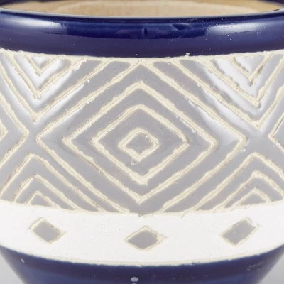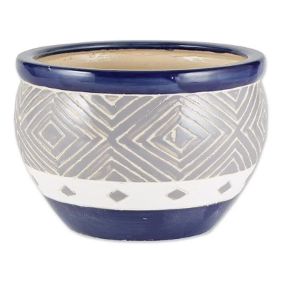 - Bright blue ceramic planters show off your greenery with a delicious dose of color! This super value set includes three pots in varied sizes, all with matching abstract motif. There is a drain hole at bottom of each pot to ensure your plant stays happy and healthy.