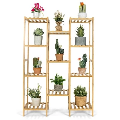 An ideal plant stand should be durable and offer great storage space. Our plant stand can meet your needs. . Its whole construction is made of natural bamboo with great durability, sturdiness and non-deformability. Thanks to this quality material, the weight capacity of each shelf is up to 22lbs/10 kg. Meanwhile, in order to create a better growing environment for plants, each layer is designed to be at a different height, which allows plants to gain full sunlight. Also, each layer is made up of some bamboo rods and there is a gap between adjacent rods. In this way, the ex ceed water will be drained in time. Of course, there is no restriction on the using places, you can place the plant stand indoors and outdoors as you want. . Specification: Color: Natural. Material: Bamboo. Overall Dimension: 45” x 11” x 32” Max Weight Capacity of Each Shelf: 22Lbs. Net Weight: 13lbs. . Package Includes: . 1 x Plant Stand. 1 x User Guide.