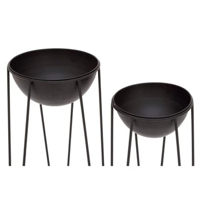 Indoors or out, these black planters add a fierce contemporary accent to your space. Each metal planter has a large bowl sitting in a black iron tripod plant stand with triangular legs. Fill each decorative planter with decorative faux plant balls for your indoor space or flowing pothos on your deck or patio! A contemporary themed item perfect for either outdoor or indoor spaces Wipe clean with a dry cloth. Suitable for indoor and outdoor use. Made in China. No drainage holes. Set includes 2 black metal planters. Contemporary design. This item comes shipped in one carton.