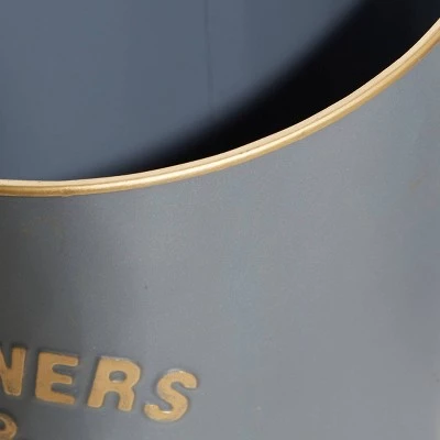 - Round shaped planter with high low opening and writing on solid pattern with slender tapered tripod legs