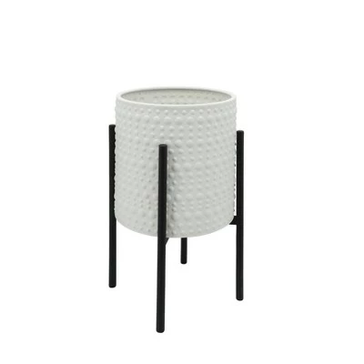 Set Of 2 White dotted planters on a black Metal Stand. These Planters Are The Perfect Unique Decor Which Will Add Timeless Minimal Style To Your Home. The dotted pattern Makes For A Beautiful Piece Of Art Work, perfect to add elegance and style to your home.Sagebrook Home has been formed from a love of design, a commitment to service and a dedication to quality. They create and import fashion forward items in the most popular design styles. Backed with years of experience in the textile field, They are now providing a complete Home decor story. the combination of wall decor, furniture, lighting and Home accessories are all coordinated with textiles to provide a complete Home look. Sagebrook Home is committed to providing the best Home dΓ©cor and accent pieces at value prices.