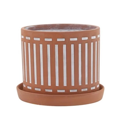 Display your most beloved plants in these beautiful planters. Featuring a geometric outside pattern painted into the material, with a saucer plate to prevent any dripping water from hitting your floor or carpet. A beautiful set that you and your plants will enjoy!Sagebrook Home has been formed from a love of design, a commitment to service and a dedication to quality. They create and import fashion forward items in the most popular design styles. Backed with years of experience in the textile field, They are now providing a complete Home decor story. the combination of wall decor, furniture, lighting and Home accessories are all coordinated with textiles to provide a complete Home look. Sagebrook Home is committed to providing the best Home décor and accent pieces at value prices.