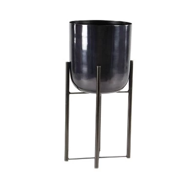 Give some metallic love to your home with this pair of tall, metallic black and brown planters in matching metal stands. Completely iron construction means lightweight, durable, and safe from the elements when placed outside! Deep, round planter bodies will beautifully display your pothos plants, as the tall height of the frames will let the leaves cascade without crowding. Neutral yet stunning dark metallic finishes complement almost any pattern or color palette while adding some pizazz to your indoor or outdoor sanctuary. Indoor/outdoor friendly, so display your favorite greenery at your front door, living room, bathroom, bedroom, patio, or deck! Wipe clean with a dry cloth. Suitable for indoor and outdoor use. Made in India. No drainage holes. Each set comes with 2 black planters with stands in varying heights. Glam inspired. This item comes shipped in one carton.