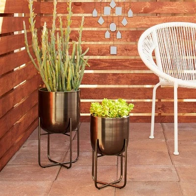 Add metallic shine and Contemporary style to your space with this pair of metallic dark silver planters in silver metal stands. Solid iron construction means lightweight, durable, and safe from the elements when placed outside. Deep, round planter bodies will beautifully display an array of plants and the extra height from the elevated bases let your vines flow freely. Neutral yet stunning metallic pewter silver finishes complement any pattern or color palette with a chic touch. Display on any floor surface from your garden to office to add a splash of sterling shine to complement your contemporary space. Feature rubber stoppers beneath each base to prevent scuffing and sliding. Wipe clean with a dry cloth. Suitable for indoor and outdoor use. Made in India. No drainage holes. Set includes 2 metal plant stands. Contemporary design. This item comes shipped in one carton.