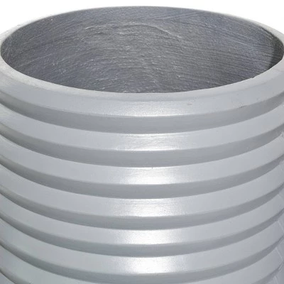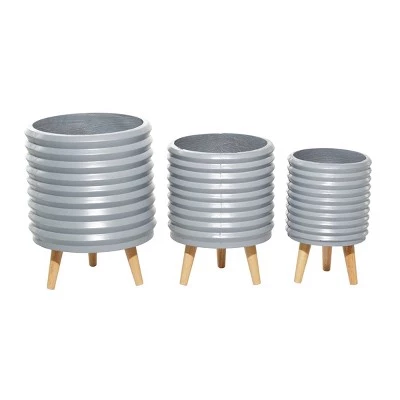 A smart chic style inspired living space knows how important mixing and matching is, especially when it comes to adding some greenery in your space. This round gray fiber clay horizontal grooves planter is up for that task. The fiber clay construction of this planter means toughness without sacrificing beauty and elegance thanks to its horizontal groove pattern design on the surface. The entire piece rests on a wooden tripod leg design with circular wooden legs in a light brown hue. This planter set will bring a much-needed freshness with indoor plants to your living room, dining room, home office or entry way. Ships in 1 carton. Suitable for indoor and outdoor use. No drainage holes. Each set includes with 3 planters. Contemporary design.