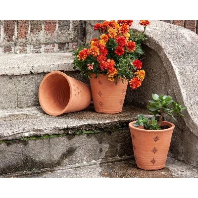 The Set of 3 Natural Hand thrown Terracotta Embossed Stamped Padma Planters offers three different complementary styles of natural terracotta pots. Hand touched at every stage by artisans in India, these planters are hand thrown, the designs are hand-stamped, and each one is finished with tonal hand-painted detailing to accent the embossed patterns.