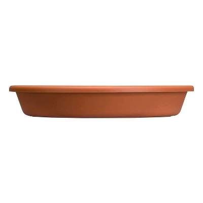 Keep your flower planters looking nice even when rain or over-watering happening. This Classic 16-Inch Round Flower Pot Saucer from HC Companies protects your porch, deck, or window sill from excess moisture.This round flower pot saucer is 16.13 inches in diameter and designed to fit round flower pots with 16-inch diameters at their base. This plant saucer features ridging on the inside that elevates your flower pot, allowing for moisture to drip. The high sides then keep moisture contained. Easily drain excess water with the removable drain plugs.This flower pot saucer is perfect for inside and outside the home. The classic terracotta-color styling goes with any indoor decor, from farmhouse to modern. The plastic plant saucer is also designed to stand up to wear inside and out. Made with durable and lightweight plastic, this plant saucer resists wear, color fading, leaking, and cracking.