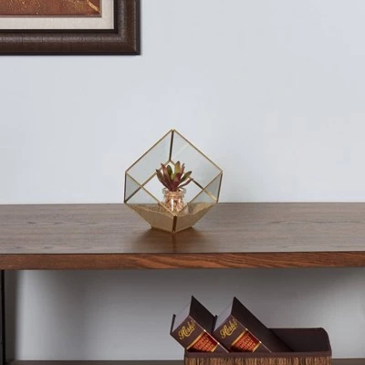 The Danya B. Cube Brass and Glass Terrarium is the quintessential modern geometric dwelling for your mini air plants, ferns and succulents. This brilliant piece features an edgy geometric design that will look great on your desk, bookcase, mantel or shelf. The modern terrarium features a bold brass metal frame and is perfect for showcasing small flower, plant, rock and even fairy garden arrangements. Have some fun and create your very own ecosystem with this unique brass and glass planter.