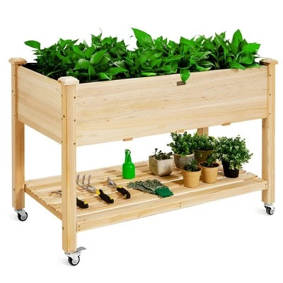 Our elevated garden bed is ideal for organizing and displaying your plants. Made of high-quality natural fir wood, this planter bed ensures solid and durable structure for long-term use. It is paired with drainage holes to drain out excess water easily. Consisting of 2 tiers, this raised garden bed is ample enough to cultivate various types of herbs, vegetables and flowers. And some of your tools, pots and soil bags can be stored on the lower shelf. Besides, it is designed in suitable height for taking care of plants conveniently and can be moved from one place to another with lockable wheels. In addition to a perfect home decoration, it can used in your garden, patio, backyard and more. Specification: Color: Natural. Material: Fir Wood. Overall Dimension: 47.5”(L) X 23.5”(W) X 33”(H). Net Weight: 35lbs. Weight Capacity of Planter Bed: 330lbs. Weight Capacity of Shelf: 110lbs. Package includes:. 1 X Planter Bed. 1 X User Guide.