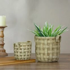 These planters would be the perfect addition to your home. Perfect to plant real or faux flowers in. Features:These planters look like tobacco baskets Comes with 1 small and 1 large planterPerfect to place on any tabletop in your homeEach pot features a drainage holeRecommended for indoor use only Dimensions: Small planter: 5.5β high x 7β in diameterLarge planter: 8.5β high x 9.5β in diameterMaterial(s): ceramic