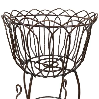 Proudly display planters and flowerpots full of beautiful flowers with this elegant planter basket. This rustic garden art is made from durable metal and features a lovely scroll design. This stylish planter stand can be used either indoors or outdoors. When used outdoors, it will develop a natural patina over time. This rustic metal lawn art is a stylish accent for the patio, sunroom, living room or yard.