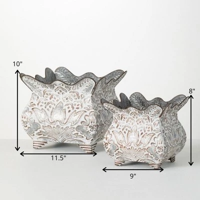 Stunning with Sullivan’s exclusive embossed flourish pattern, this pair of planters comes in an 8″ and 10″ heights. The unique scalloped edges along the opening add a touch of individualism, quintessential to the design of this metal set of two. Exclusive “exploded artichoke” pattern. Over the last 52 years, Sullivans has become an industry leader in home decorations. Our brand is rooted in tradition while incorporating modernized trends to keep your home looking up to date with timeless style. Here at Sullivans, we pride ourselves on creating product designs focused on quality and value, ensuring that our customers have access to beautiful products at reasonable price points.