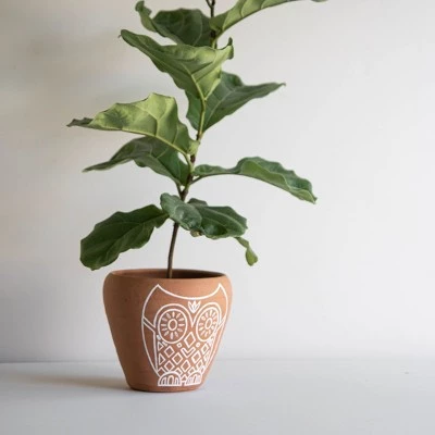Terracotta clay is rich in color and texture in its natural state. To further that texture on this terracotta planter there is a beautifully intricate owl drawing that is hand painted by artisans in India. Hand thrown terracotta brings out the beauty of this perfectly handcrafted pot. This piece is sure to add a boho flair to your home, while also offering a trendy base for your favorite plants.