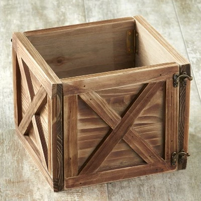 Add a lovely country accent to your porch or patio with this large planter wrap box that has a hinged door on the side. Featuring the look of reclaimed barn wood, it wraps around your store bought plant to hide the container. A hinged door makes it simple to place and remove your desired floral home accent. Sturdy materials means it can be used inside or outdoors in a covered spot. Features X-shaped trim like that on a traditional barn door. Wood and iron. Assembly required; assembly hardware included. 10″ sq. x 8″H