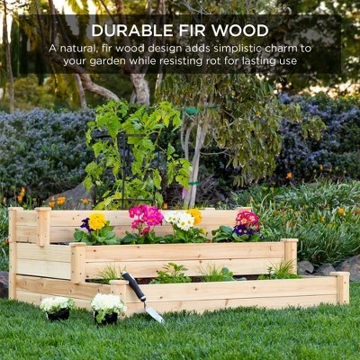 Customize each tier of this 3-tier garden bed by utilizing each tier to separate a variety of plants from delicious veggies to beautiful flowers, herbs, and more! Made with a stair-step design, it has 3 planter depths that accommodate different root requirements and plant sizes; perfect for small roots, medium, roots, and large roots. Its versatile build also allows for different arrangements, making it easy to stack your planter sections vertically or lay them out in a flat, 3-section arrangement. Our claims of an easy assembly + sturdy build are made true as you seamlessly slide panels into slotted, reinforced corner legs for stability. Enjoy it for years to come, with a natural, durable fir wood design that adds simplistic charm to your garden while resisting rot for lasting use.