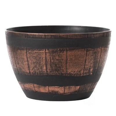 Add a vintage appeal to your home, garden, and patio with this rustic half-barrel flower pot. This planter is ideal for flowers, trees, and plants to compliment your outdoor and indoor decor. Made out of sturdy plastic, wood- looking, and weather-resistant material. The antique burnt finish will add a rustic country appearance to your garden and outdoor living.