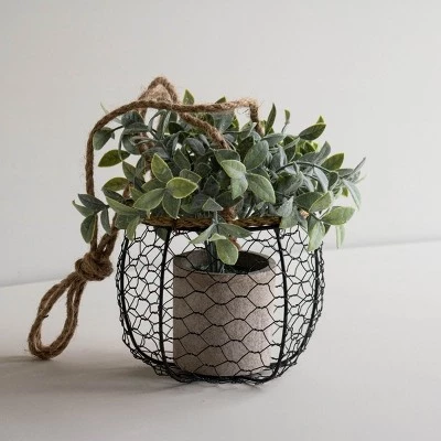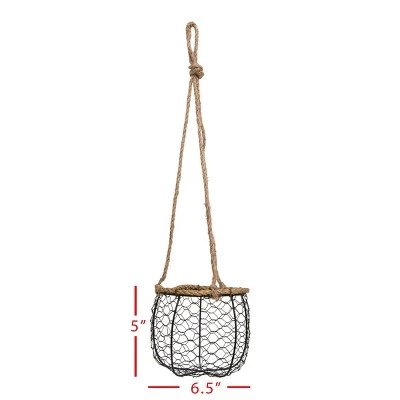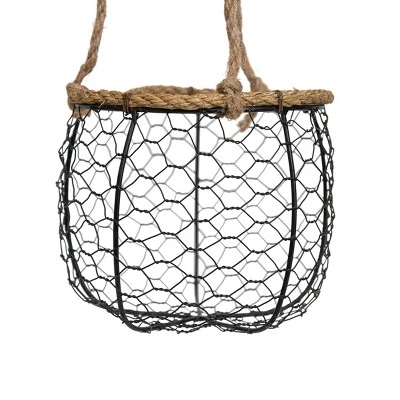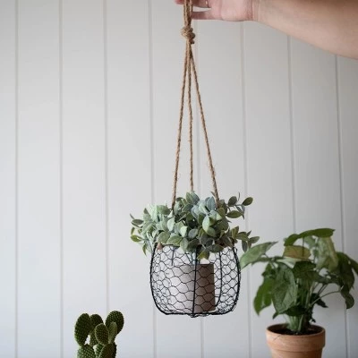 From Foreside Home & Garden, a textural hanging planter basket. Display your favorite greenery in an updated take on chicken wire in a clean black finish. The jute rope paired with the black wire offers a light rustic touch. Jute is a vegetable fiber that is made from the bark of jute plants. It is the most environmentally friendly fiber because its fibers can be recycled more than once. This basket will add unique traditional flavor to any room.