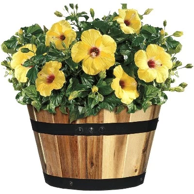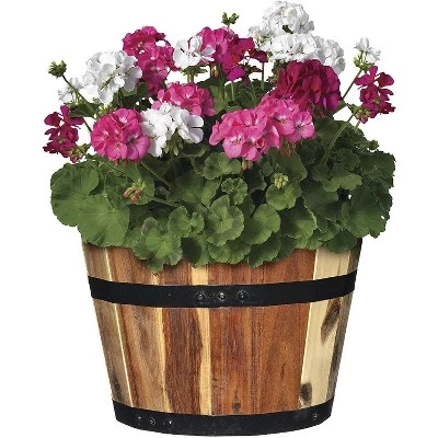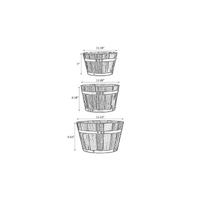 Trio of 3 high quality nesting barrel planters, accented with metal bands that hold the barrel together and make the design very solid. The planters are made of stunning acacia wood characterized by distinct natural markings, the wood is treated with natural oil which will age the barrel to a golden brown. Acacia wood is 1.5x the hardness of oak, making these barrels extremely durable and capable to be used indoors and outdoors. Small, Width: 11.38 inches Height: 7 inches Medium, Width: 12.88 inches Height: 8.38 inches Large, Width 15.63 inches Height 9.63 inches